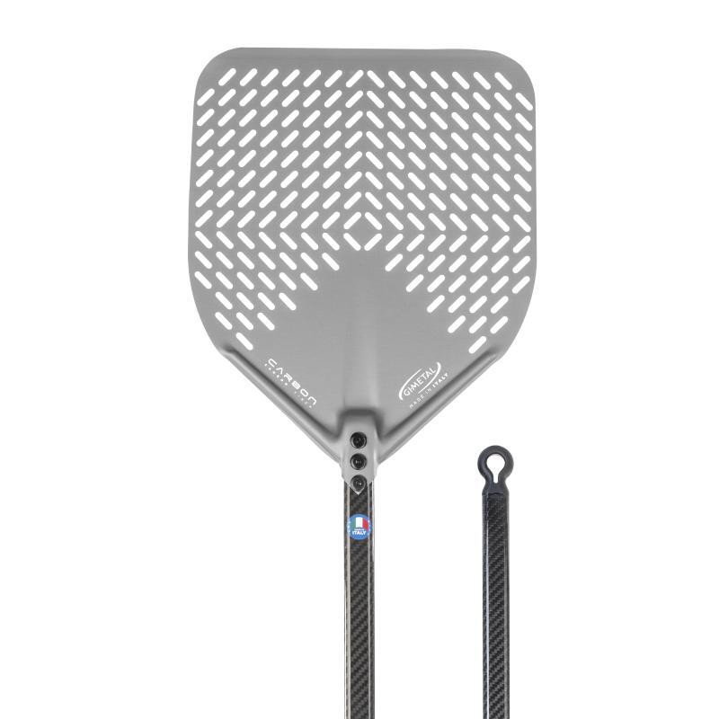Perforowana łopata do pizzy – Gi.Metal o średnicy 33 cm wykonana z anodowanego aluminium z uchwytem z włókna węglowego – Linea Carbon. Rączka 60 cm.